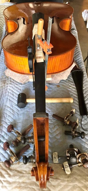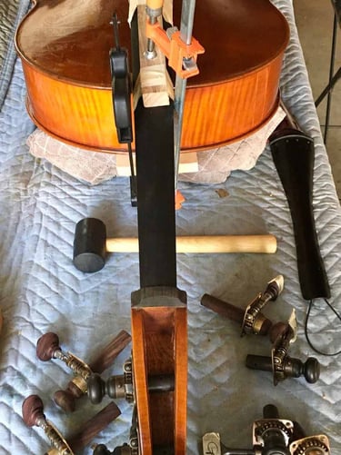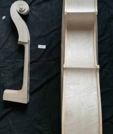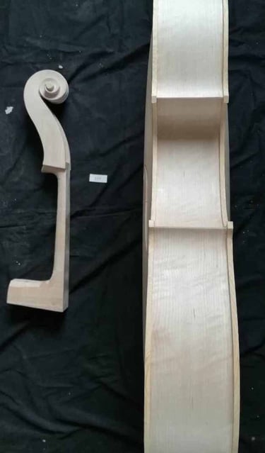 My first goal was to reduce the overall mass and weight of the instrument. To explore this idea, I designed and built an experimental bass called the Bassetto. I began by researching the lightest wood species suitable for instrument making and discovered Paulownia—a remarkably lightweight wood, comparable to balsa, yet strong enough to serve as a soundboard. Interestingly, I came to learn that Paulownia has been used for millennia in traditional string instruments across East Asia. To further lighten the weight, I simplified the instrument’s shape by removing the corners, inspired by early Italian corner-less basses, and abstracted the scroll. The final result was a 5/8-size, flat-back bass with reduced mass and a shorter vibrating string length. The experiment proved to be quite promising, offering a more manageable instrument without compromising tonal integrity.