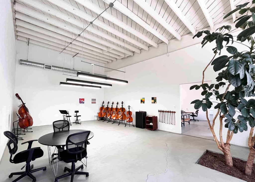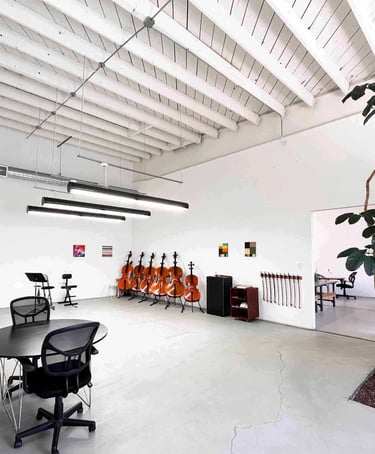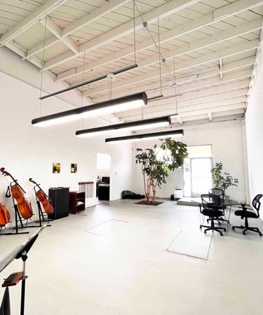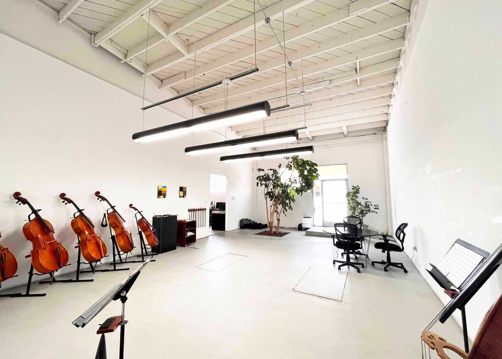 Approximately 700 sqft. Studio with high ceiling and skylights for practice, performances, teaching, recordings, and others.